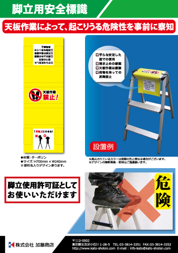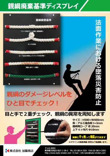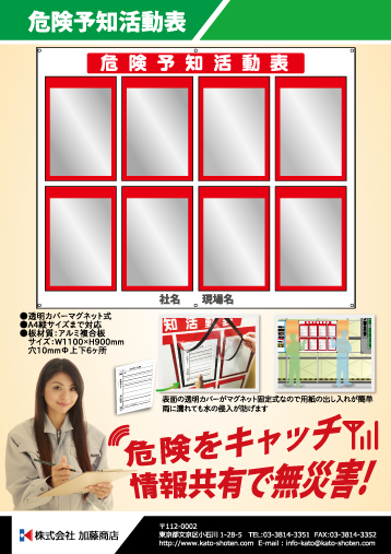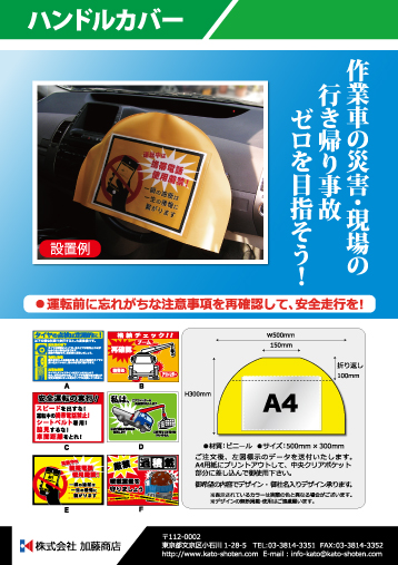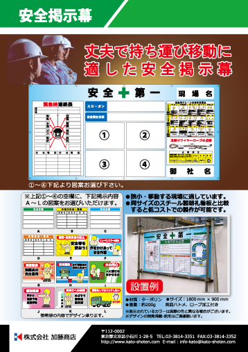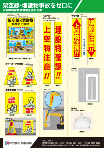 ・伸縮反射ベスト ・サマーメッシュベスト ・親綱廃棄基準ディスプレイ ・危険予知活動表 ・ハンドルカバー ・安全掲示幕 ・脚立用安全標識 ・安全旗 社旗 木枠両面看板 ・架空線 埋設物事故をゼロに